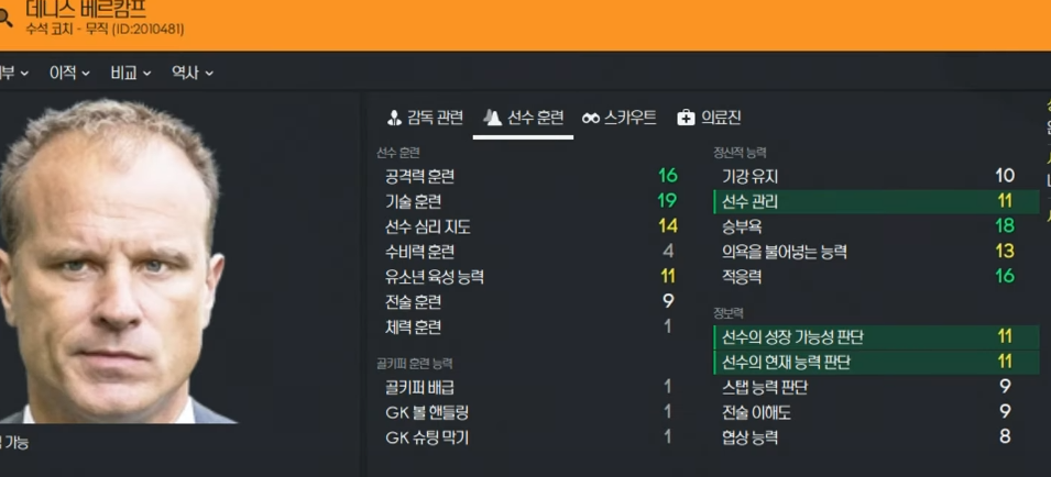 훈련쪽 다좋고 선수들 어빌포텐 판단잘하며 전술이해도도 좋아서 수석코치로도 매우 좋지만 기강유지쪽이 매우낮기 때문에 아쉽지만 중하위권팀은 영입한다면 나쁠것이없습니다.