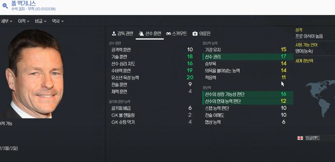 수비뿐만 아니라 전술훈련까지좋아서 여러가지 유용하게 사용할수있습니다. epl 중하위권도 영입이 가능할만큼 벽이 높지 않기 때문에 무조건 영입해야할 코치중하나입니다.